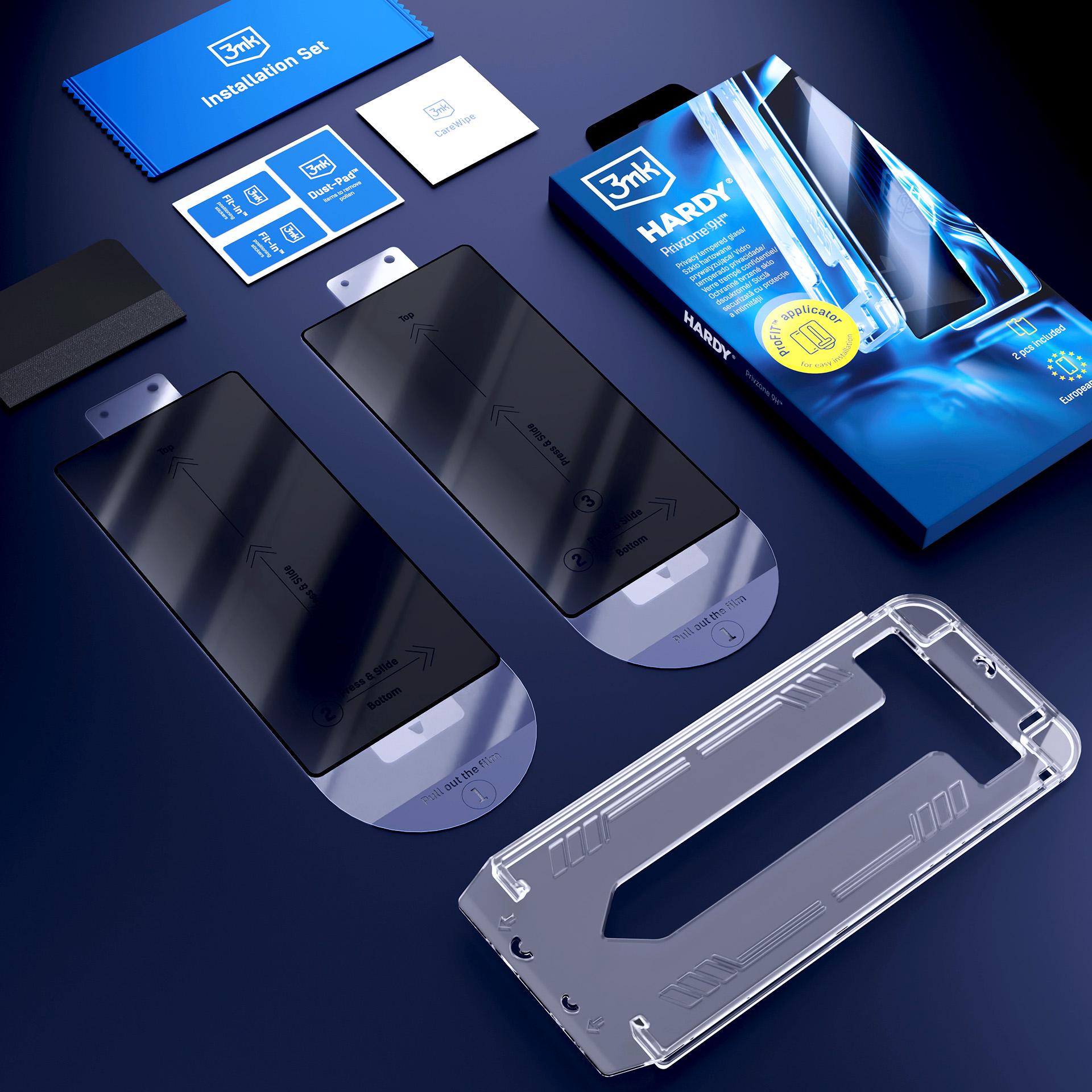 CountriesTempered privacy glass protects the screen from side glances starting at a 28° angle. It includes the ProFIT™ applicator, which enables quick and precise installation without bubbles or dust. The set includes 2 pieces – one for immediate use and the other as a spare.