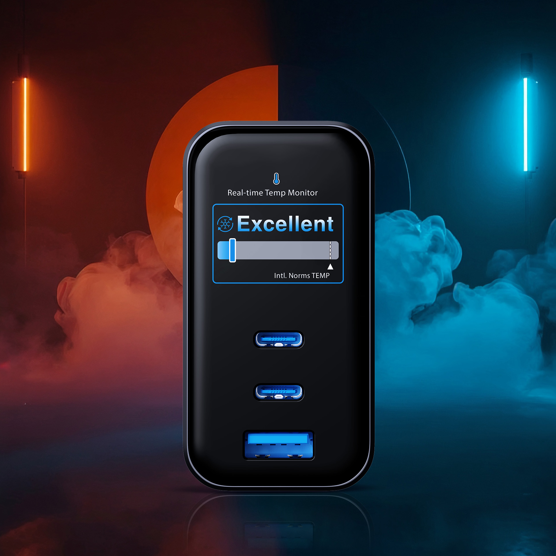 CountriesSmart charger with TFT screen, which shows power, temperature and working time in real time. GaN 67 W = fast, safe charging without overheating. Three USB-C/USB-A ports charge laptop, phone and accessories simultaneously. Full power, full control.